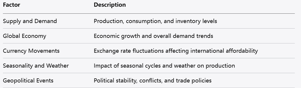 تحليل سوق السلع: فهم ما يدفع أسعار السلع أمر حاسم لأي شخص مهتم بهذا المجال، سواء لأغراض التداول، أو اتخاذ قرارات الأعمال، أو الدراسات الاقتصادية. نادرًا ما تتحرك أسعار السلع بشكل منعزل؛ بل إنها تستجيب لمزيج معقد من القوى. تتناول هذه المقالة العوامل الرئيسية التي تؤثر على أسعار السلع، مقدمة نظرة شاملة للمبتدئين في تداول السلع.