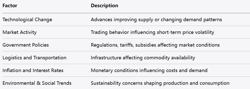 يمكن أن تؤدي التغييرات في النشاط الصناعي أو التحول نحو مواد بديلة إلى تغيير مستويات الطلب أيضًا. على سبيل المثال، قد يقلل التبني المتزايد لمصادر الطاقة المتجددة من الطلب على بعض الوقود الأحفوري، مما يؤثر على أسعاره.