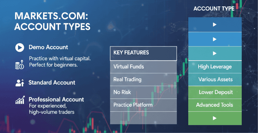 تقدم Markets.com عدة أنواع من الحسابات المصممة لتناسب أنماط التداول المختلفة وتفضيلات المتداولين: