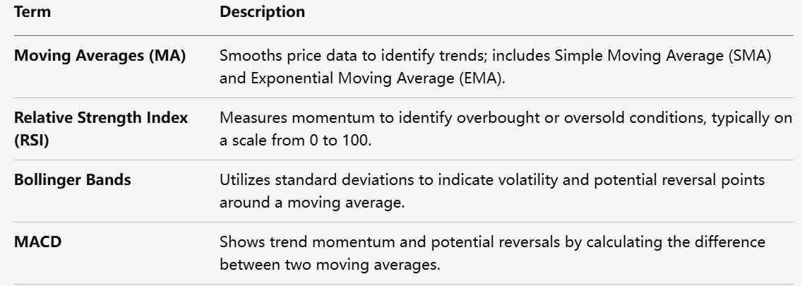 المتوسطات المتحركة (MA): تعمل على تنعيم بيانات الأسعار لتحديد الاتجاهات. ومن أشهر أنواعها المتوسط المتحرك البسيط (SMA) والمتوسط المتحرك الأسي (EMA).