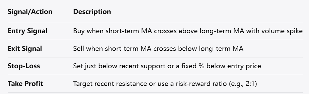 بالنسبة للمبتدئين، قد يكون الأسلوب المباشر هو أفضل نقطة انطلاق. فيما يلي استراتيجية تداول يومي بسيطة تعتمد على المتوسطات المتحركة وحجم التداول: