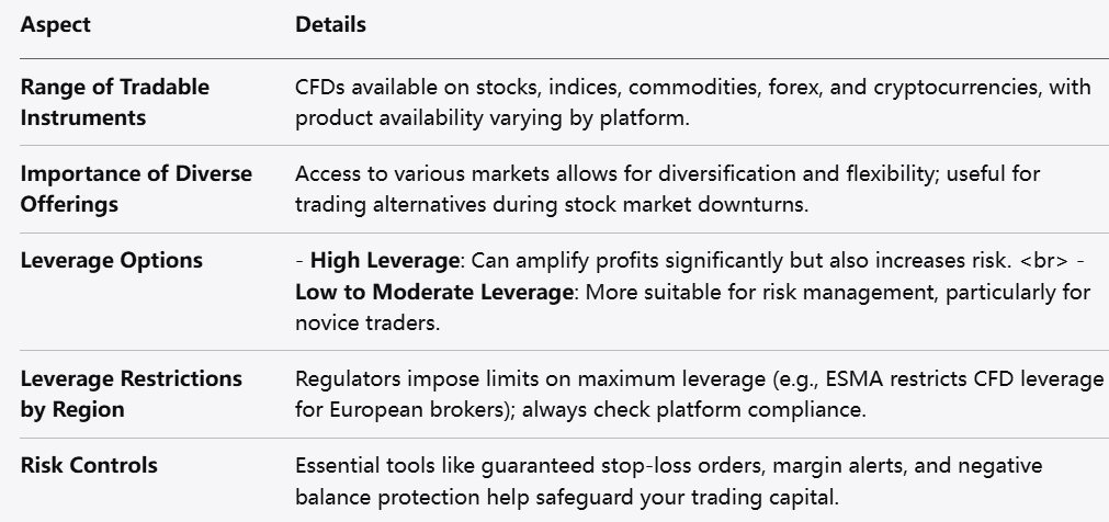 بينما تسمح العقود مقابل الفروقات (CFDs) بالتداول على الأسهم، المؤشرات، السلع، الفوركس، والعملات الرقمية، إلا أن ليس كل المنصات تقدم نفس نطاق المنتجات. ضع في اعتبارك اهتماماتك في التداول وما إذا كانت المنصة تغطي الأصول التي ترغب في التداول بها.