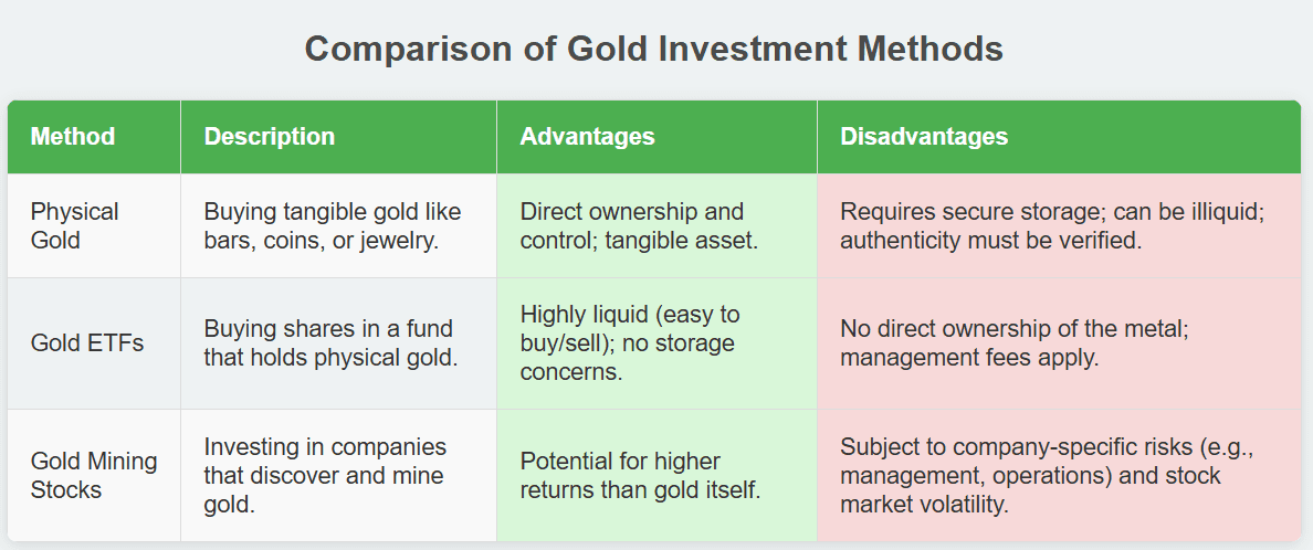 يمكن الاستثمار في الذهب بعدة طرق تناسب مستويات مختلفة من الخبرة والقدرة المالية: