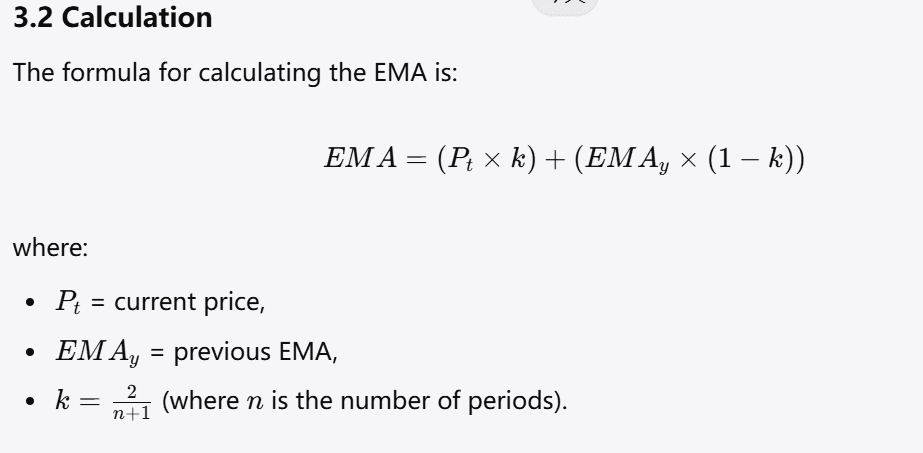 يعطي المتوسط المتحرك الأسي (EMA) وزنًا أكبر للأسعار الأخيرة، مما يجعله أكثر استجابة للمعلومات الجديدة مقارنة بالمتوسط المتحرك البسيط (SMA).