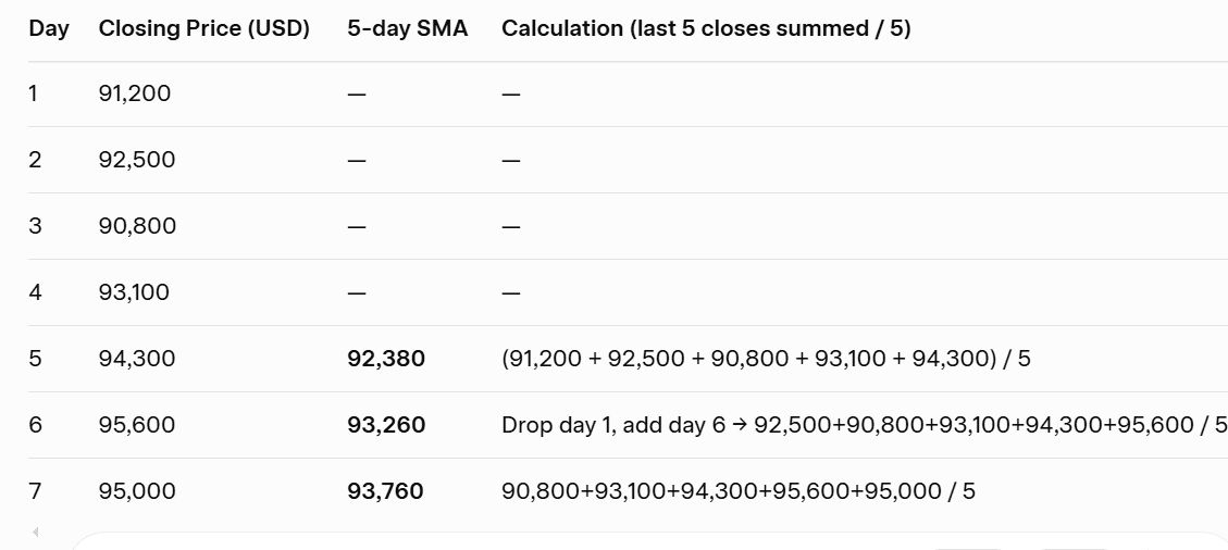 فيما يلي مثال واقعي موجز يوضح كيف تساعد المتوسطات المتحركة في تسوية بيانات الأسعار، باستخدام أسعار الإغلاق اليومية التقريبية لبيتكوين (BTC-USD) في أوائل يناير 2026 (استنادًا إلى مستويات السوق حول 92,000–96,000 دولار أمريكي منتصف يناير 2026).