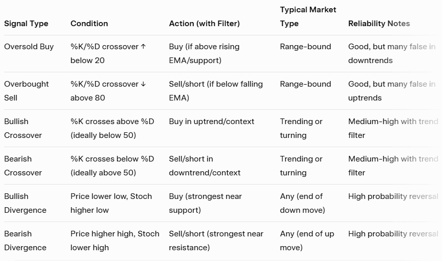 → الشراء عندما يكون السعر أعلى من EMA 50 وأعلى من EMA 200، ويخترق خط %K خط %D صعودًا دون مستوى 50 (أو من منطقة التشبّع البيعي).