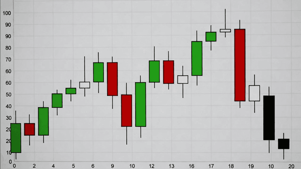 فيما يلي سلسلة أسعار واقعية لمدة 20 يومًا تُظهر اتجاهًا صاعدًا قويًا يفقد زخمه تدريجيًا في الأيام الأخيرة (مكاسب أصغر، إغلاقات تبتعد عن القمم، وظلال علوية أكبر). يُعد هذا السيناريو إعدادًا كلاسيكيًا لحدوث انفراج سلبي (Bearish Divergence) على مؤشر الستوكاستك.