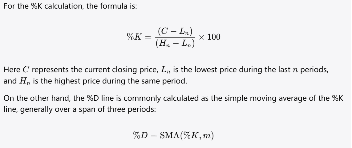 لفهم كيفية عمل المذبذب العشوائي، من الضروري التعرّف على طريقة حسابه. تعتمد المعادلة الأساسية لمؤشر الستوكاستك على مقارنة السعر الحالي بأعلى وأدنى الأسعار خلال فترة زمنية محددة.