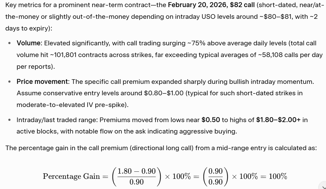 في 18 فبراير 2026 (جلسة متقلبة تأثر فيها خام النفط بمخاوف العرض وبيانات المخزون)، شهدت USO نشاطًا غير عادي كبير في الخيارات، خاصة في خيارات الشراء (Calls) التي تعكس رهانات مضاربية على صعود الأسعار.