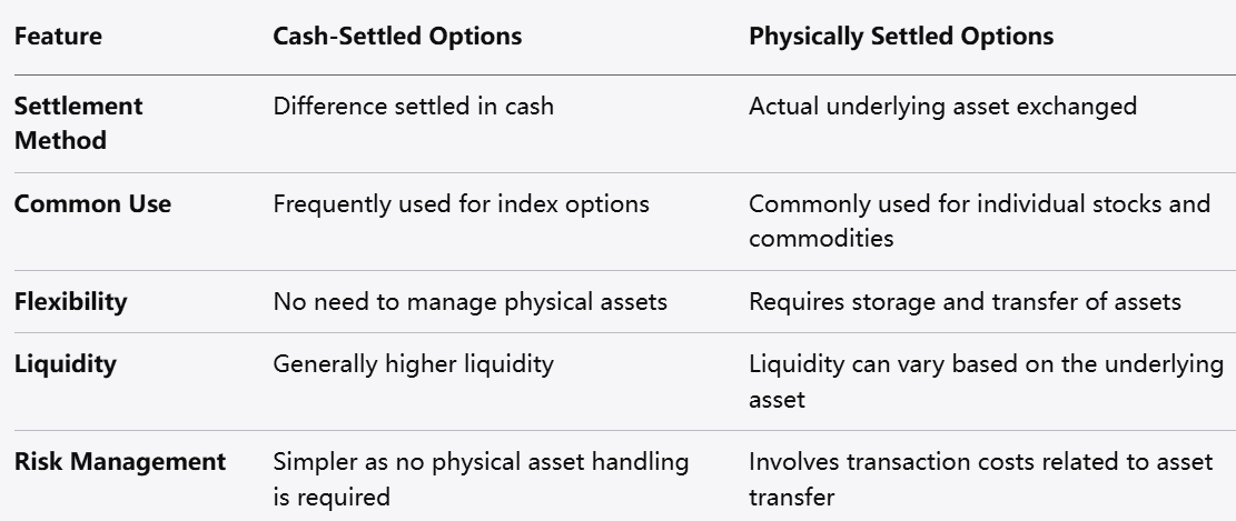 الخيارات المُسواة نقديًا: لا يتم تبادل الأصل الأساسي؛ بدلاً من ذلك، يُسوى الفرق بين سعر الإضراب للخيار والسعر الفعلي في السوق نقدًا. يُستخدم هذا الأسلوب عادةً في خيارات المؤشرات.