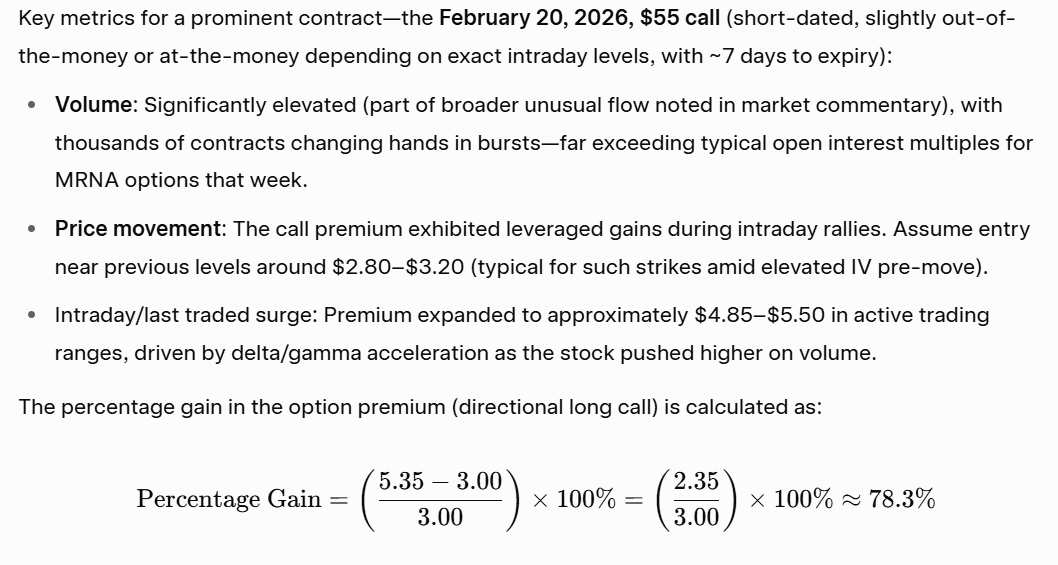 في 13 فبراير 2026 (جلسة يوم الجمعة)، أظهرت أسهم موديرنا (MRNA) نشاطًا غير معتاد في الخيارات جنبًا إلى جنب مع تحركات السهم المتقلبة داخل اليوم. ركز التداول المكثف على خيارات الشراء قصيرة الأجل، مما يعكس رهانات مضاربية على استمرار الصعود أو حماية من الانعكاس.