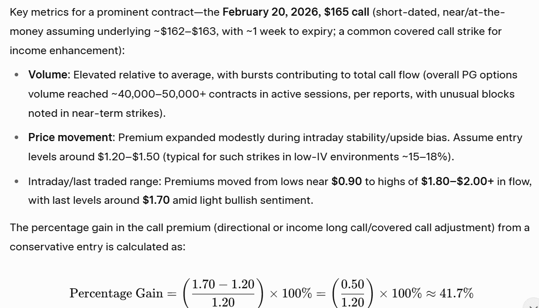تم تداول أسهم PG في نطاق ضيق نسبيًا (~160–165 دولار) خلال أوائل إلى منتصف فبراير، مدعومة بنتائج قوية للربع الثاني (تجاوز EPS، رغم انخفاض طفيف في الإيرادات) وتأكيد التوقعات للعام المالي 2026 (~6.83–7.09 دولار EPS). طبيعة السهم منخفضة التقلب (~0.6–0.7 بيتا) حدت من التحركات الحادة، لكن شهدت الخيارات نشاطًا ملحوظًا حيث وضع المتداولون مراكز للاستقرار أو صعود معتدل.