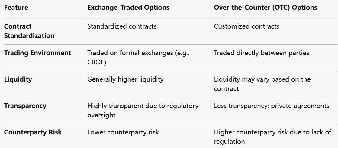الخيارات المتداولة في البورصة: عقود موحدة يتم تداولها في بورصات رسمية مثل بورصة شيكاغو للخيارات (CBOE)، مما يوفر بيئة منظمة للتداول. تتميز هذه الخيارات عادة بسيولة وشفافية أعلى.