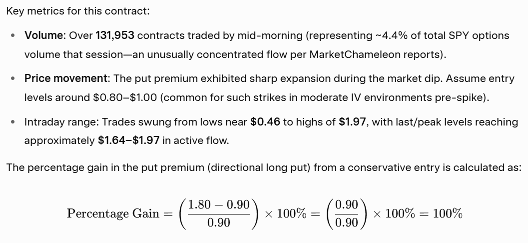في 17 فبراير 2026، أظهر مؤشر SPY ضغطًا هبوطيًا كبيرًا خلال اليوم، مع تداول في جلسة متقلبة وسجلت معنويات هابطة نتيجة عناوين الأخبار الاقتصادية الكبرى. شهد خيار البيع (Put) عند مستوى 675 دولارًا ليوم 17 فبراير 2026 (قصير الأجل، خارج النقود أو قريب من النقود حسب المستويات الدقيقة، مع 0–1 يوم حتى الانتهاء) نشاطًا متفجرًا.