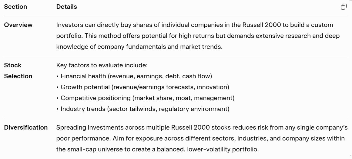 يمكن للمستثمرين بناء محفظة استثمارية من خلال شراء أسهم شركات فردية مكوِّنة لمؤشر راسل 2000. وعلى الرغم من أن هذا الأسلوب قد يحقق عوائد مميزة، إلا أنه يتطلب قدرًا كبيرًا من البحث وفهمًا عميقًا لأساسيات كل شركة واتجاهات السوق.