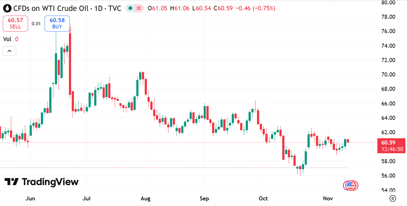 تداول خام WTI عند 60.75 دولار: يُعد خام غرب تكساس الوسيط (WTI) معيارًا رئيسيًا لأسعار النفط في الولايات المتحدة، ويلعب دورًا مهمًا في أسواق الطاقة العالمية.