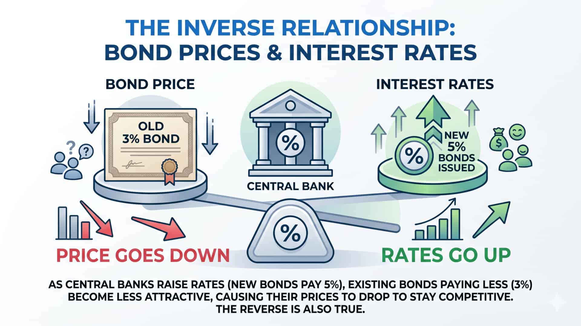 Why would any investor buy your old 3% bond when they can easily get 5% elsewhere? They wouldn't—unless you sell your 3% bond at a steep discount. Therefore, as interest rates go up, the price of existing bonds must go down to remain competitive.