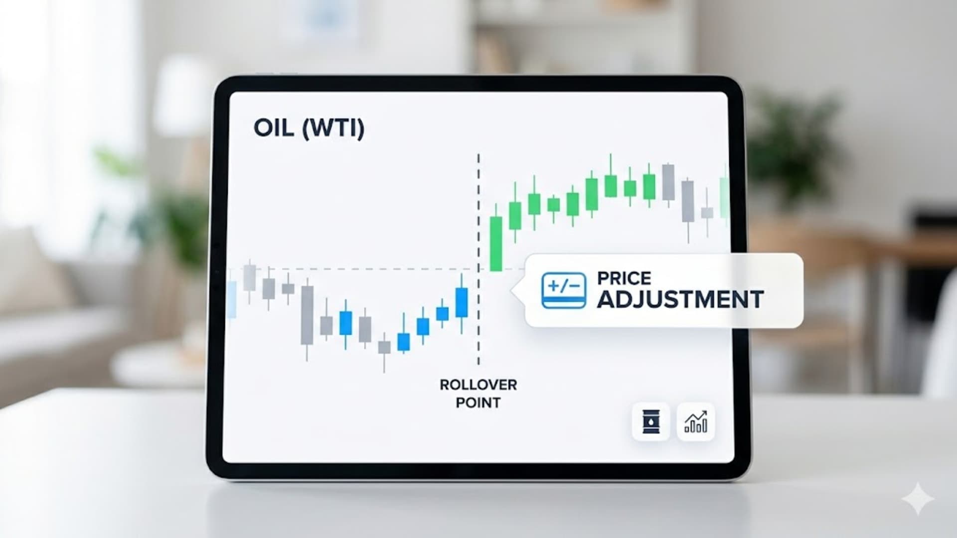 First, your position stays open, but the contract reference changes (e.g., from "US Oil Sept" to "US Oil Oct"). Second, the quoted price on your screen will change to reflect the new contract. Consequently, the chart appearance may look different, often displaying a visible gap where the old contract ended and the new one began.