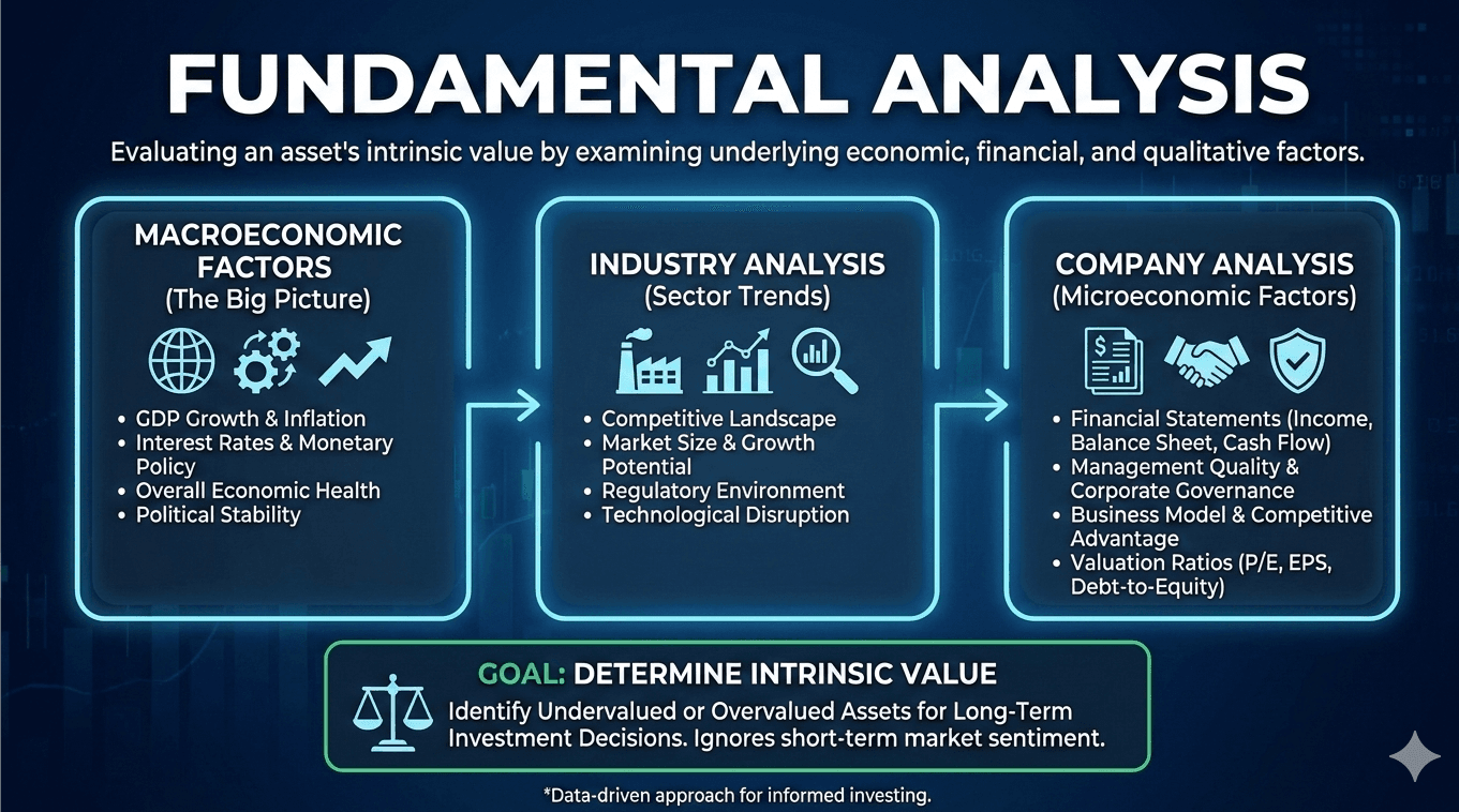 Fundamental analysis is a method of evaluating an asset’s value by studying the economic, financial, and other qualitative and quantitative factors that may affect its price. The goal is to understand the intrinsic value of an asset and its potential for growth or decline.
