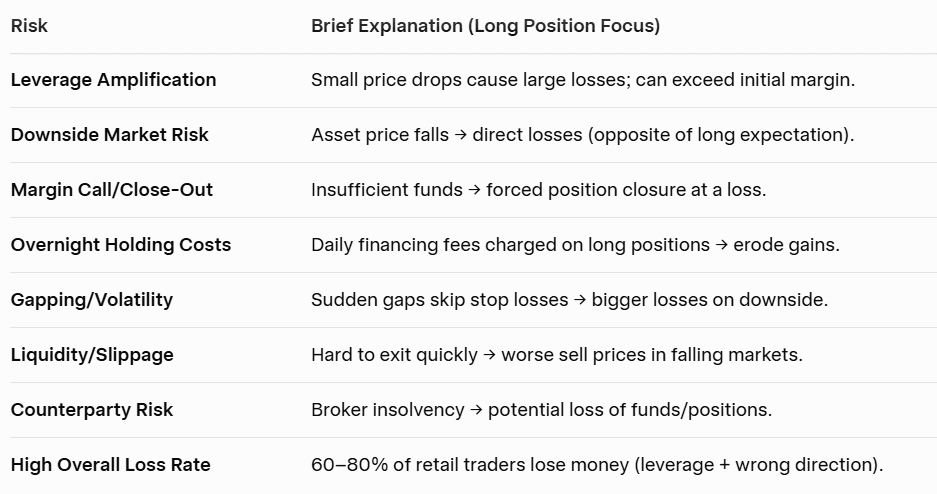 Long Position: Risk is limited to the initial capital invested, but market downturns can lead to large financial losses.