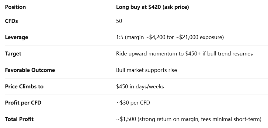 Profit: ~$30 per CFD → total ~$1,500 (strong return on margin, fees minimal short-term).