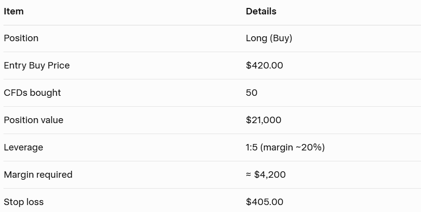 Position: Long buy at $420 (ask price).