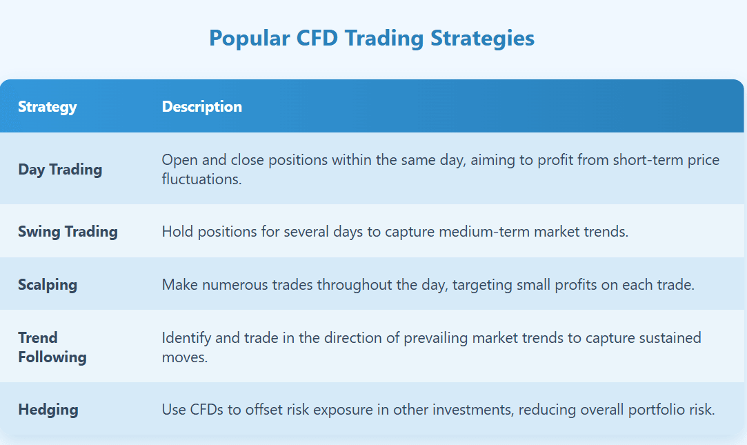 Various strategies can be applied to CFD trading depending on the trader’s style and goals.