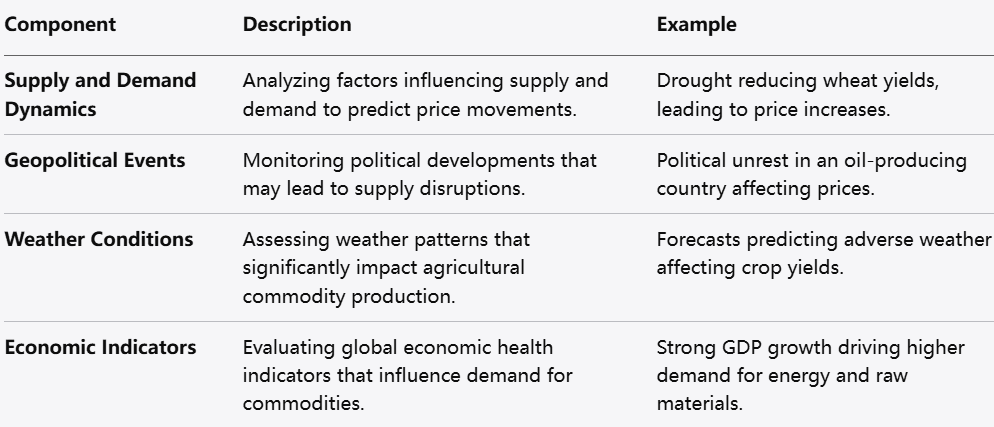 Fundamental analysis involves assessing the intrinsic value of commodities based on external factors. Key components include: