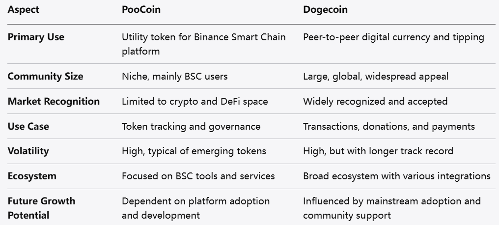 Purpose: PooCoin focuses on providing tools and services for Binance Smart Chain users, whereas Dogecoin started as a meme coin but has evolved into a widely recognized digital currency.