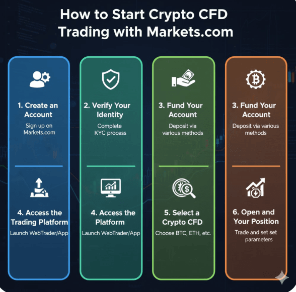 Starting crypto CFD trading with Markets.com involves understanding the fundamentals of CFDs, setting up an account, funding it, and executing trades. With the right research, analysis, and risk management strategies, you can take advantage of the volatility in the cryptocurrency market.