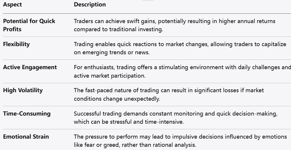 Potential for Quick Profits: Traders can realize gains swiftly, which may lead to higher annual returns compared to traditional investing.