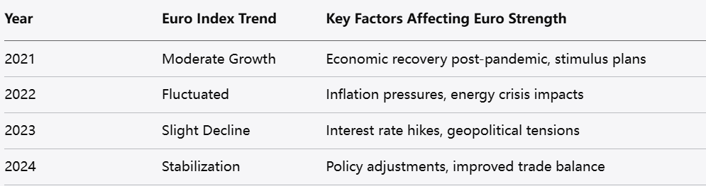 At the same time, external influences like trade relations, geopolitical events, and shifts in global demand have also impacted the euro’s relative value. Various euro-related indices that track the currency’s performance against a basket of other currencies reflect these dynamics, demonstrating periods of resilience and pressure.