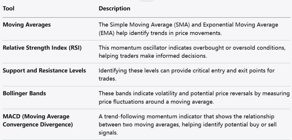 Technical analysis focuses on historical price movements to forecast future trends. Key components include: