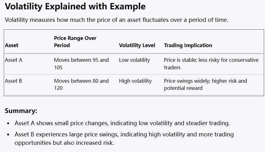 Volatility refers to the degree of variation in the price of an asset over time. High volatility means prices move sharply in either direction, while low volatility indicates more stable price movements.