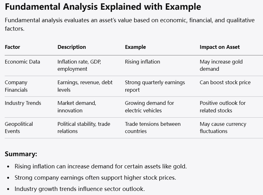 Fundamental analysis evaluates the intrinsic value of an asset by examining economic, financial, and qualitative factors affecting its supply and demand. It is commonly used for stocks but also applies to currencies, commodities, and cryptocurrencies.