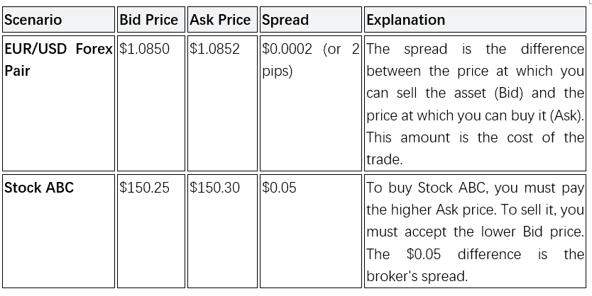 The spread is the difference between the buying price (ask price) and the selling price (bid price) of a financial instrument at any given time. It essentially represents the cost of executing a trade and is one of the primary ways brokers earn from trading activities.