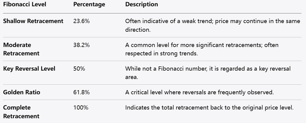 50%: While not a Fibonacci number, this level is widely regarded by traders as a key reversal level.