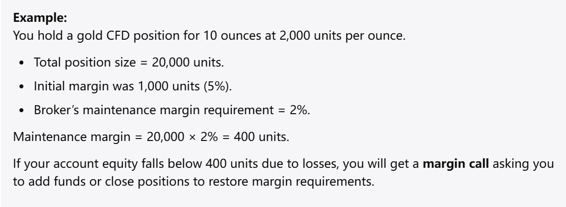 If the trader's account equity falls below this level due to adverse price movements, the broker may ask the trader to deposit additional funds or close positions to reduce exposure.