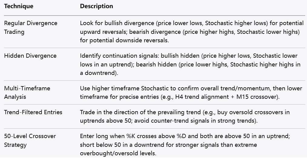 For traders eager to maximize the potential of the stochastic oscillator, implementing advanced trading techniques can provide a competitive edge. Multi-timeframe analysis is one such approach, enabling traders to view price action across different time intervals to strengthen their trading decisions. By analyzing the stochastic oscillator over longer timeframes while executing trades on shorter ones, traders can identify overarching trends while pinpointing optimal entry and exit points.