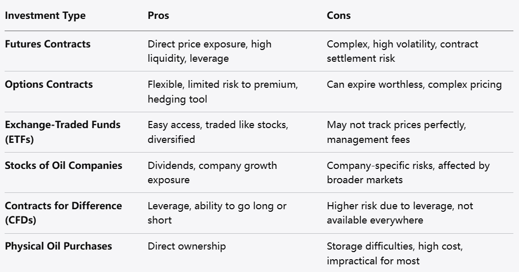 There are several ways to invest in crude oil, each with its own advantages and disadvantages: