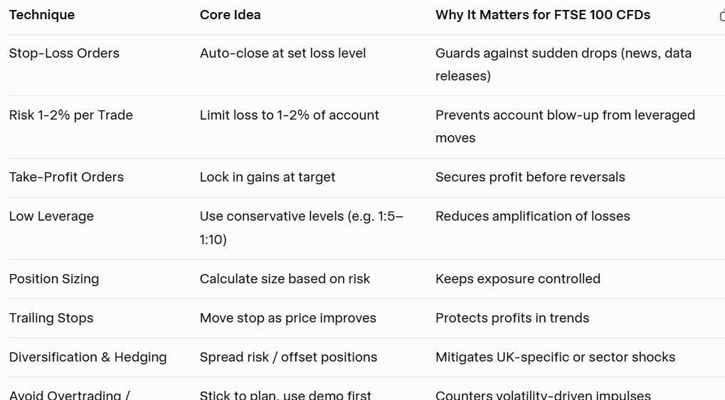 Hedging is a risk management strategy employed by traders to offset potential losses in one position with gains in another. When trading FTSE 100 CFDs, hedging can protect against market volatility.