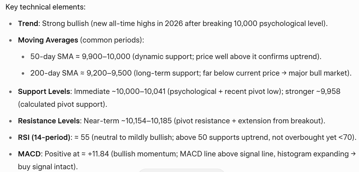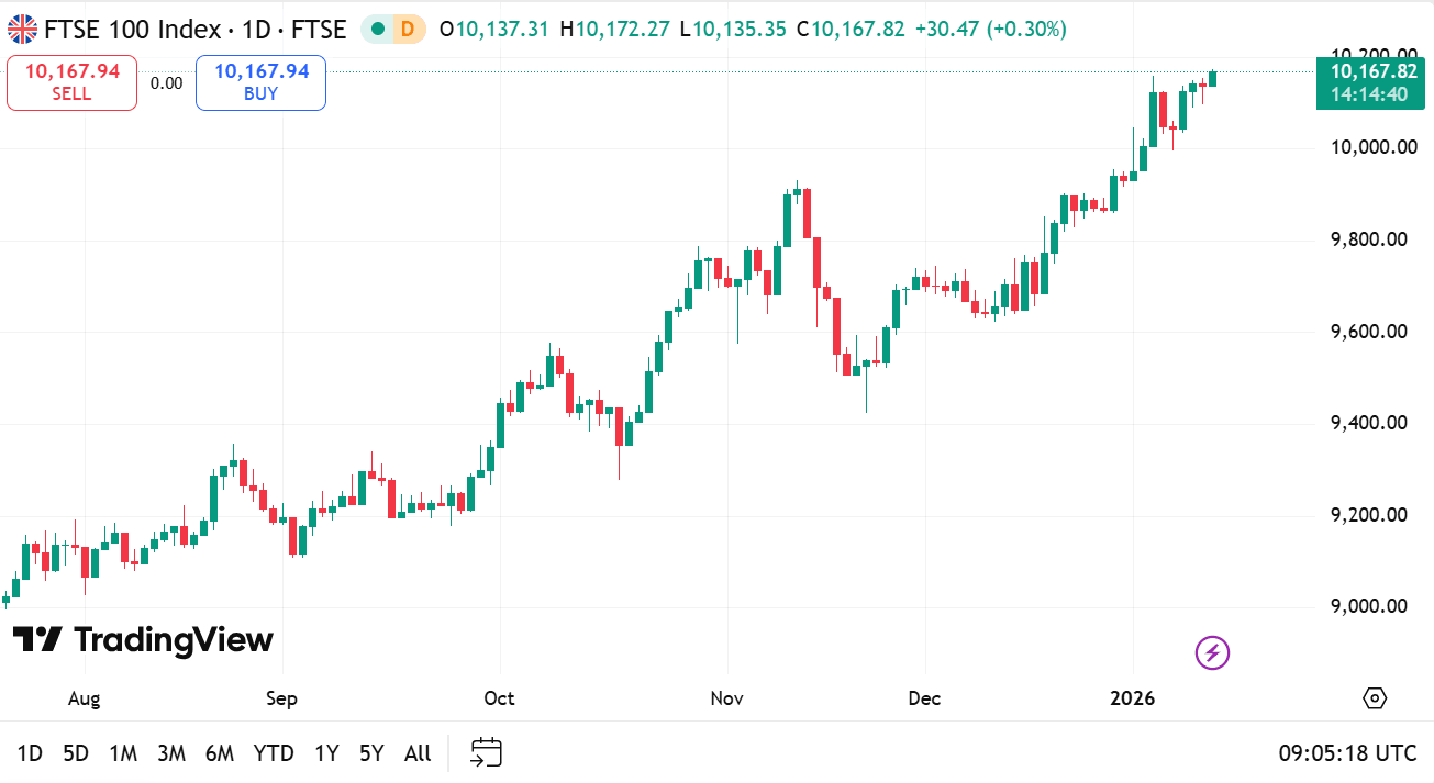 Entering 2026 (as of mid-January), the FTSE 100 has already broken the symbolic 10,000 milestone for the first time intraday and on closes in early January (e.g., hitting ~10,046 shortly after New Year, with levels around 10,054–10,142 recently amid some pullbacks from oil/miner softness).