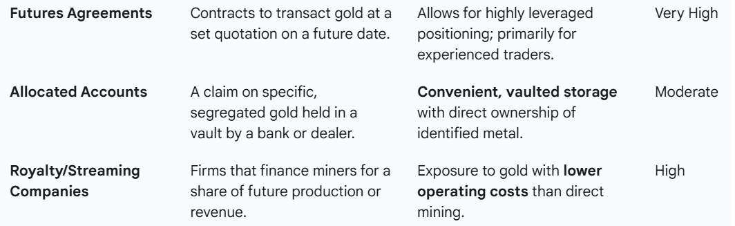 Futures Agreements: These are standardized, legally binding contracts traded on an exchange that obligate the purchaser to buy or the seller to sell a specified amount of gold at a predetermined quotation on a certain date in the future. They are primarily used for managing risk and speculation.