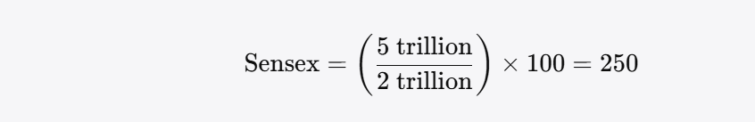 Let’s illustrate how Sensex is calculated. If the total market capitalization of the 30 companies in the index is currently 5 trillion and the base market capitalization is 2 trillion, the calculation would be: